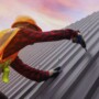 A roofing contractor wearing a hard hat, high-visibility safety vest, and gloves uses a power drill to secure a metal roof under a colorful sunset sky. The scene highlights professional roofing work in South Carolina.